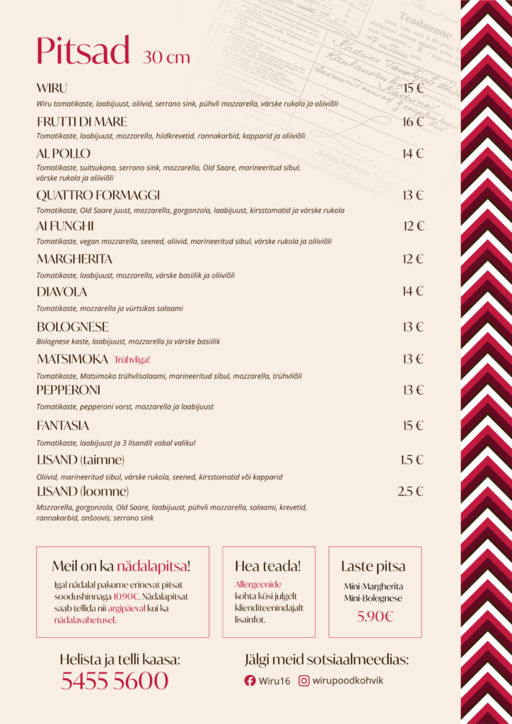 Wiru kokad küpsetavad iga päev ehtsaid itaaliapäraseid pitsasid ja muid hõrgutisi ning argipäevadel lõunaroogi. Pidevalt täituvad koogi- ja saialetid ning kogukonnapoe riiulid.