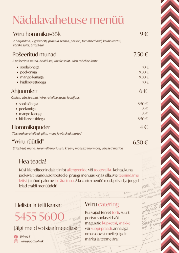 Nädalavahetustel saad Wirus nautida tõeliselt pealinlikku brunchi menüüd – pošeeritud munad, ahjuomletid, täidetud pannkoogid…you name it!
